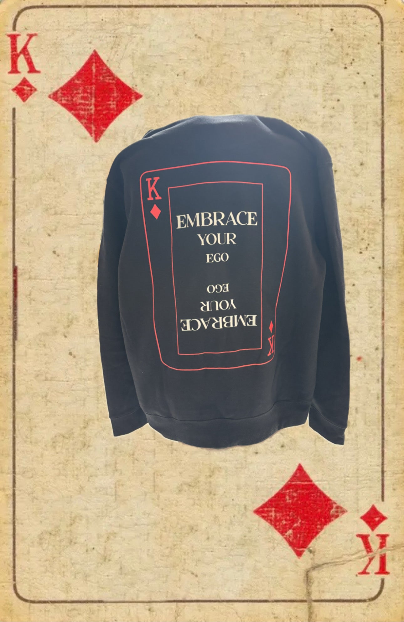 Make a bold statement in the world with our second addition to King Marc’s “Embrace Your Ego" collection. This eye-catching design features a mirrored playing card layout with a powerful message: "EMBRACE YOUR EGO." Printed in sleek red and white on cotton, this cotton hoodie speaks to confidence, being apathetic towards people’s opinions, and unapologetic individuality. The double-sided card design reflects the duality of the your hidden potential, true self style, and the successful person you strive to be on the inside, your ego.